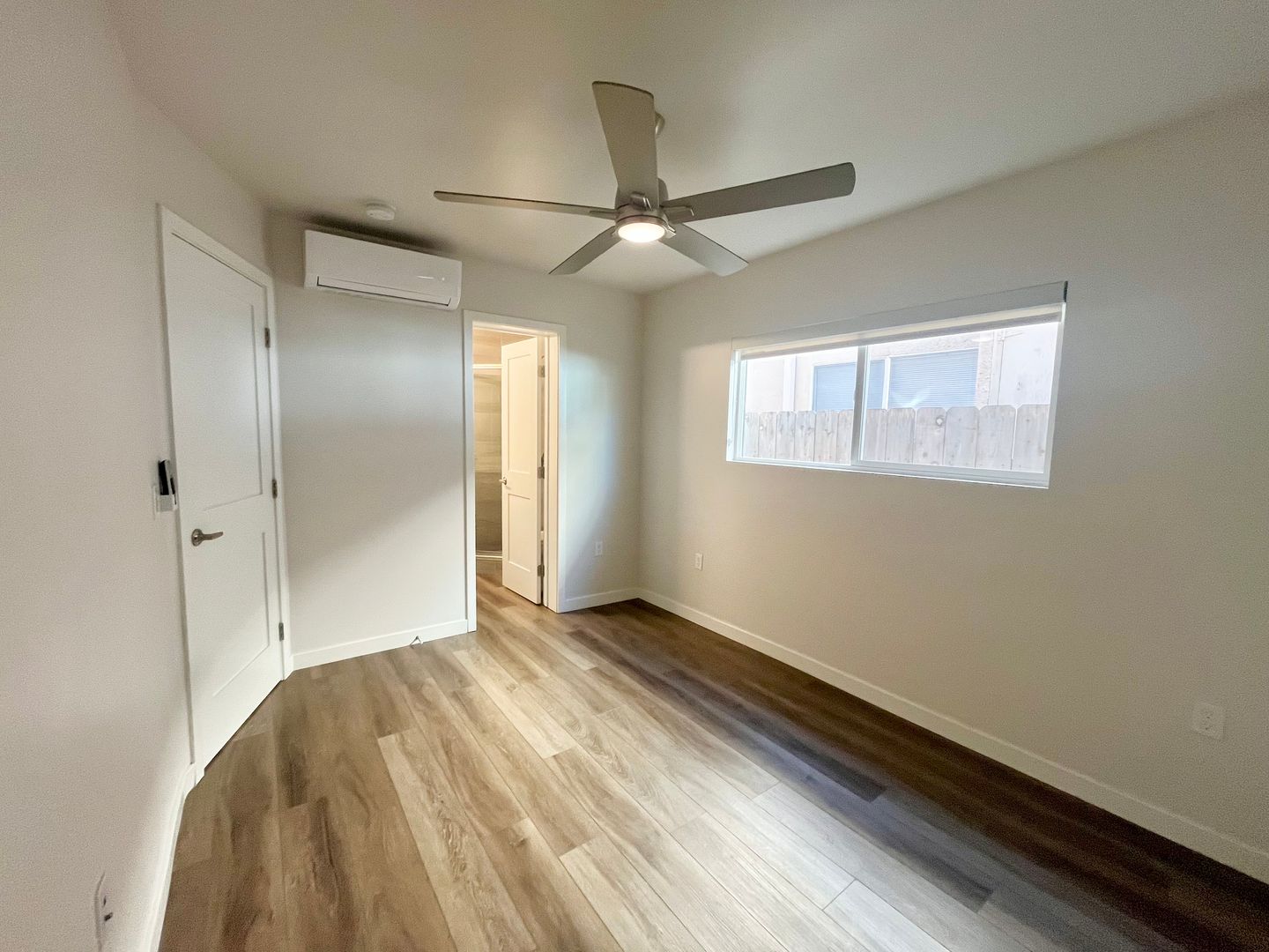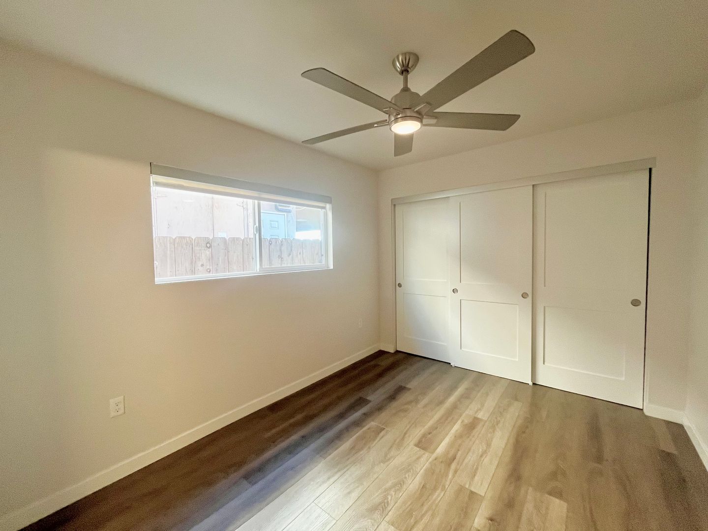 Plank flooring throughout, dual pane windows, ceiling fans and walk in closet.