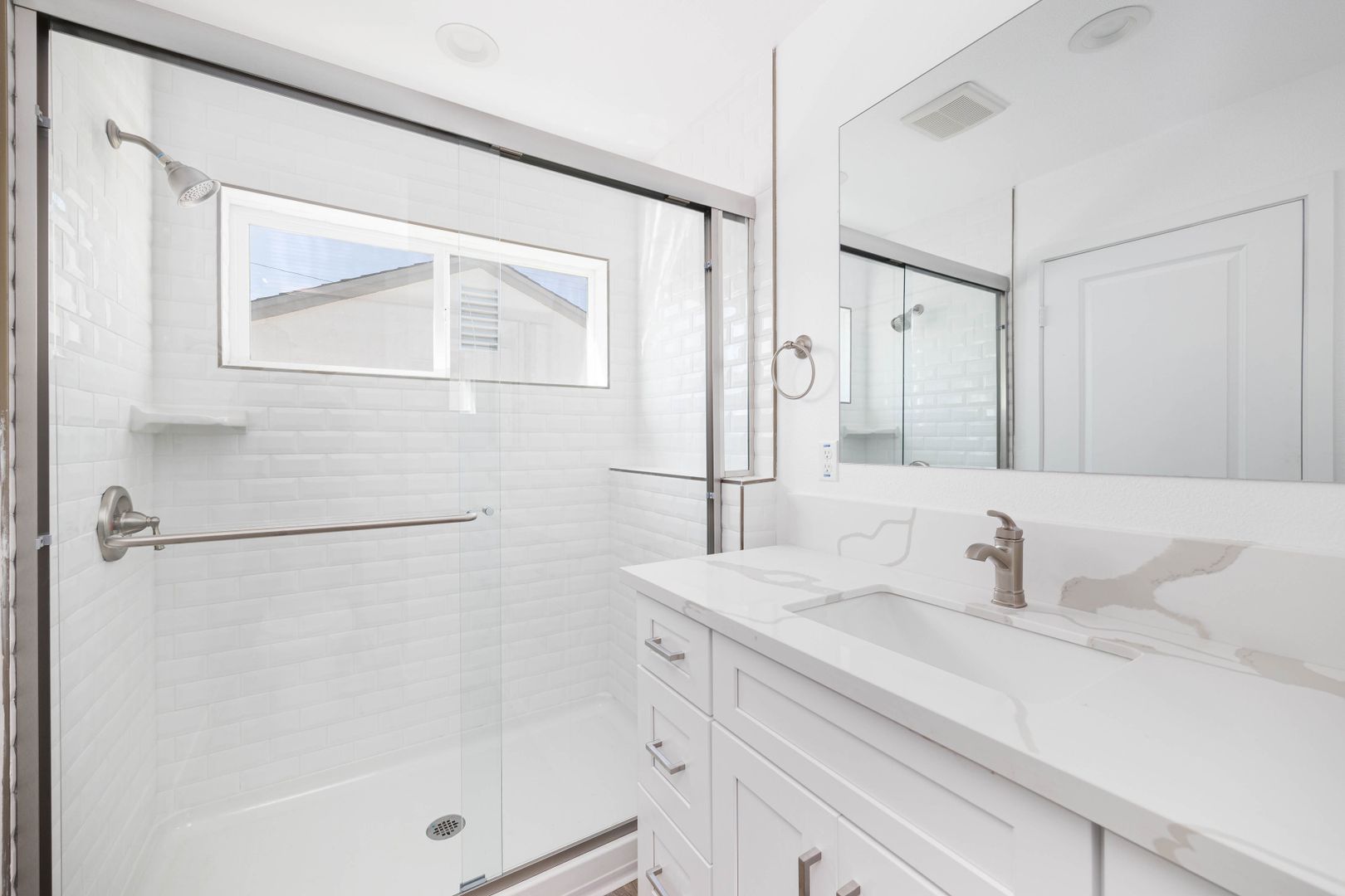 The fabulous bathrooms offer subway tiles, large vanity sinks and plenty of storage!
