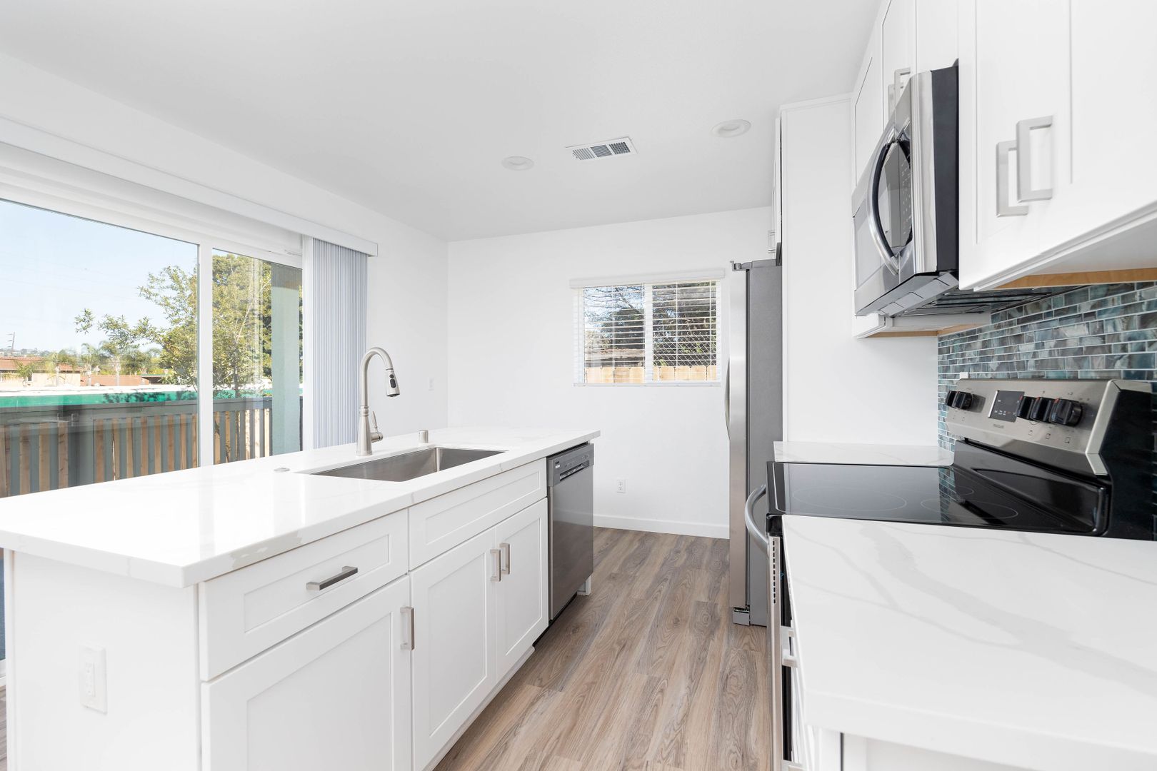 The open kitchen offers granite countertops, refrigerator, gas stove/oven, stainless steel appliances, sink, and a microwave.
